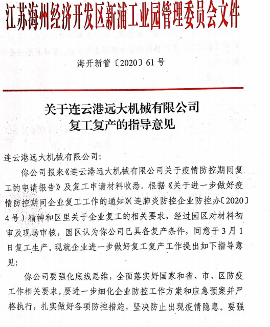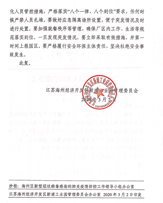 在前期的精心準備下,我公司已于3月1日通過疫情防控、安全生產、環保生產三項驗收,3月2日獲得復工批文并于今日正式復工。公司將強化底線思維,全面落實好國家和省、市、區防疫工作的相關要求。在扎實做好各項防控措施的基礎上,堅決杜絕疫情的發生。