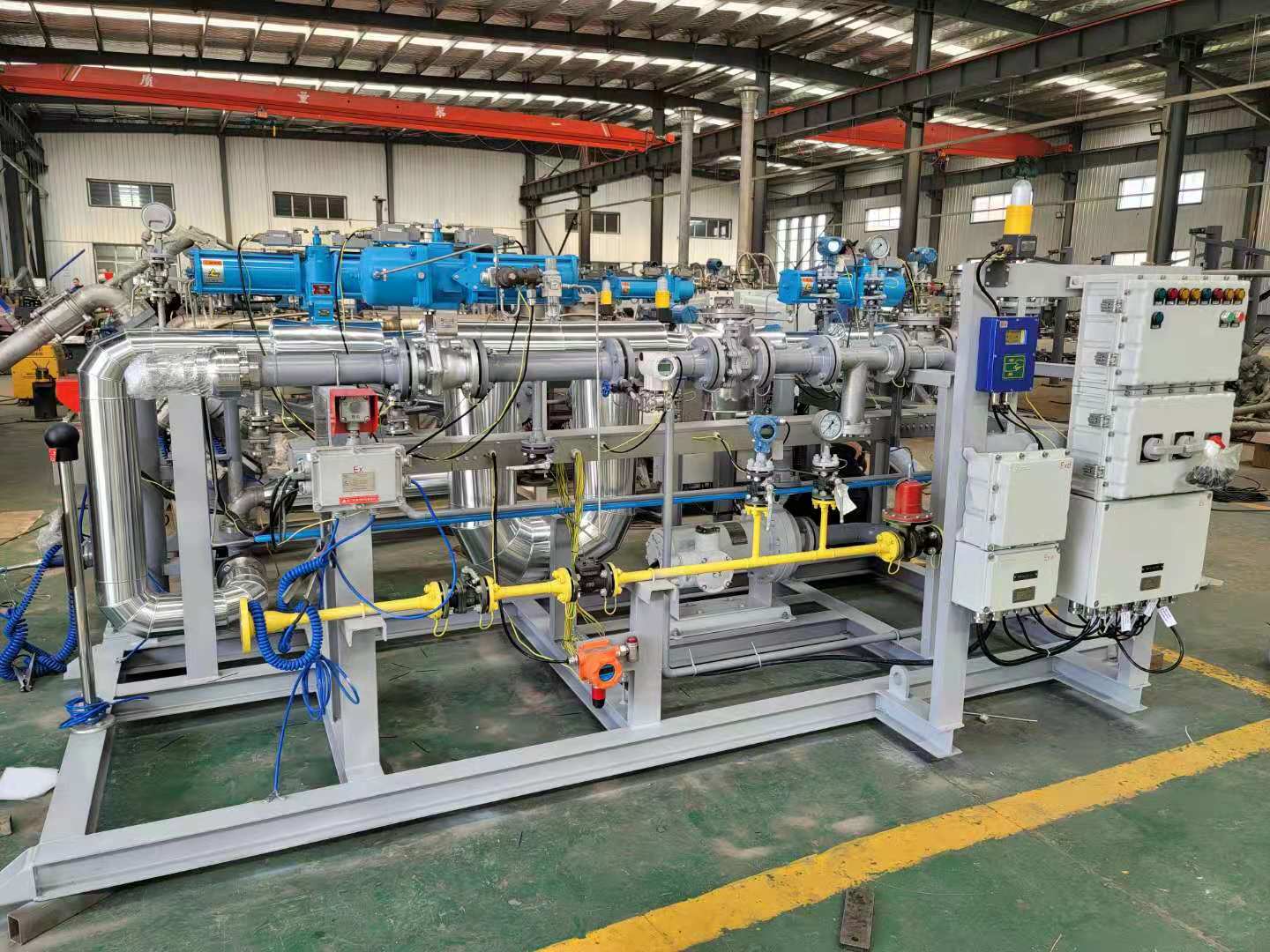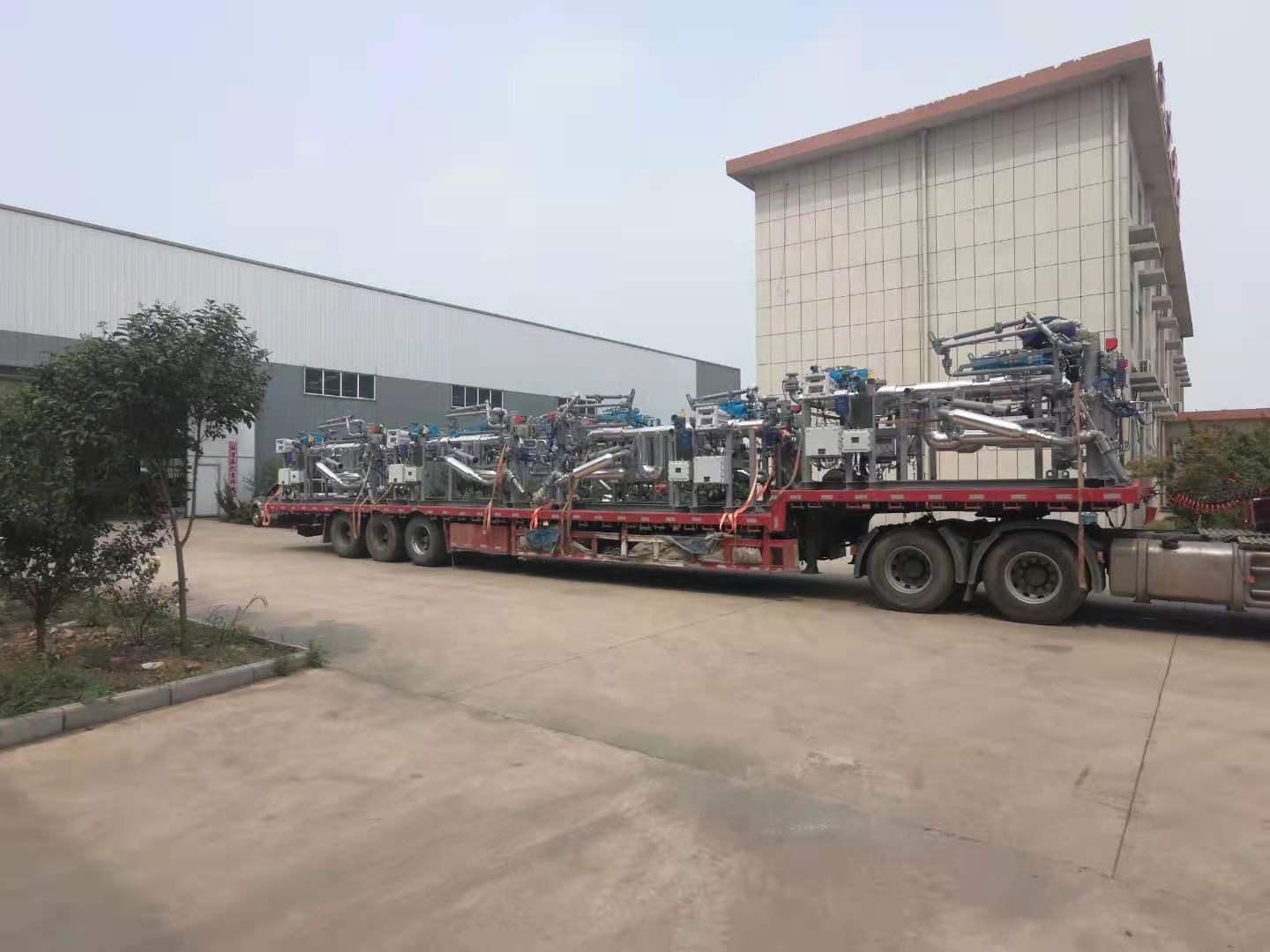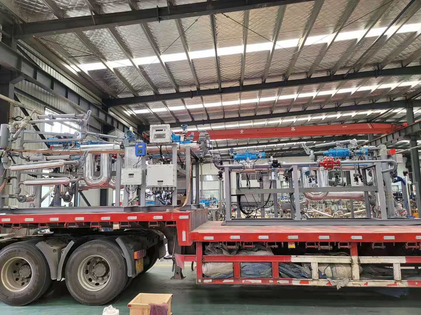 油品及化工品定量裝車橇裝組是指將每一個裝車鶴位內的儀表和設備集成在一個專用的框架結構內,儀表和設備包括裝車鶴管、流量計、防溢油靜電報警控制器、壓力變送器、裝車流量控制閥、緊急切斷閥,裝車泵、批量控制器等, 只預留工藝連接口和控制電源和通訊接口,這個整體集成部分稱為裝車橇。與傳統的裝車控制系統就地組裝比較,裝車橇可以節省現場設計和現場施工量,縮短項目工期,提高裝車控制系統的質量。以下是近期公司定量裝車撬的生產及發貨現場。